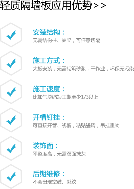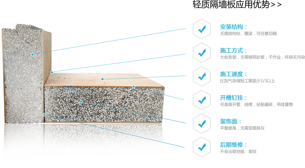 輕質(zhì)隔墻板的面板是專業(yè)的防水板,有良好的防水,防潮性能,可適用于廚房、衛(wèi)生間、地下室等潮濕區(qū)域。環(huán)保、整體性好、抗沖擊性能強(qiáng),用于鋼結(jié)構(gòu)方法錨固,墻體強(qiáng)度高,可做高層、跨度大的間隔體,整體抗震性能高于普通砌磚墻體多倍。復(fù)合隔墻板系統(tǒng)結(jié)構(gòu)緊密,整體性好,不變形,墻面不易松散,抗震性好。