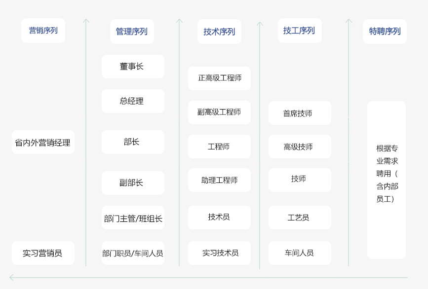 山東茂盛管業(yè)有限公司十分注重人才的利用和員工的發(fā)展,為使不同能力素質(zhì)、職業(yè)興趣的員工都可以找到適合自己的上升路徑,公司明確了不同職系的晉升評(píng)估、管理辦法,為員工提供橫向縱向“并存的雙軌制”職業(yè)發(fā)展通道,充分給予員工不斷上升的機(jī)會(huì)。員工可根據(jù)自身的實(shí)際情況選擇“營(yíng)銷序列、管理序列、技術(shù)序列、技工序列、特聘序列”五種職業(yè)生涯發(fā)展方式。
